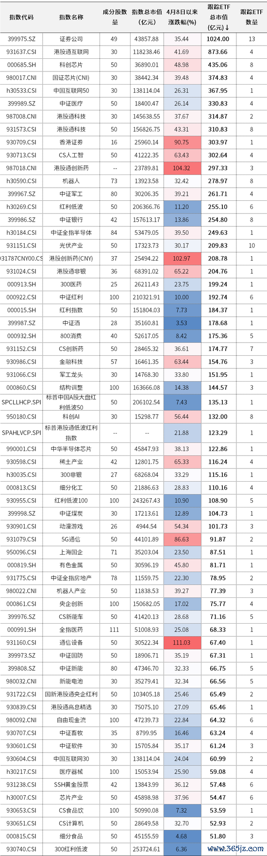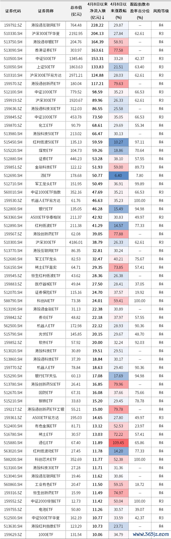 限度现在,自4月8日反弹以来,获超10亿元资金净买入的ETF共62只,具体如下表所示。