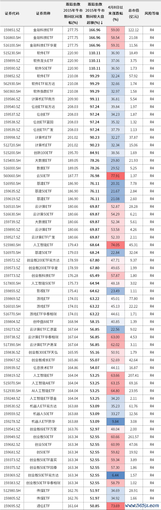 2015年的牛市行情,咱们以2014年11月20日至2015年6月12日为区间,本领有83只消ETF追踪的指数跑赢上证指数超50%,其中最新市值超亿元的有63只,具体如下表所示。