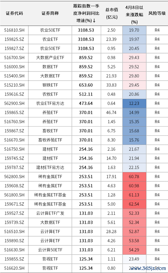 限度现在,ETF所追踪指数中,2025年一季度净利润(上市公司中报尚未裸露杀青)同比增速超100%的一共有10只。对应追踪的ETF共27只,具体如下表所示。